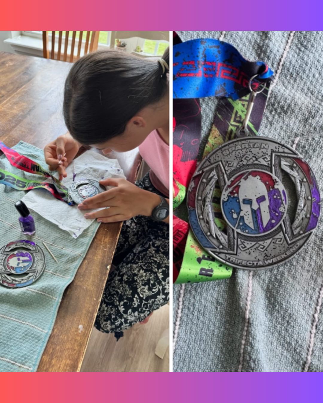 Seen on the Southern Spartans FB page. Joseph Tessari shares some pics for adding color to a trifecta weekend medal with nail polish I do believe! Pretty Sweet!