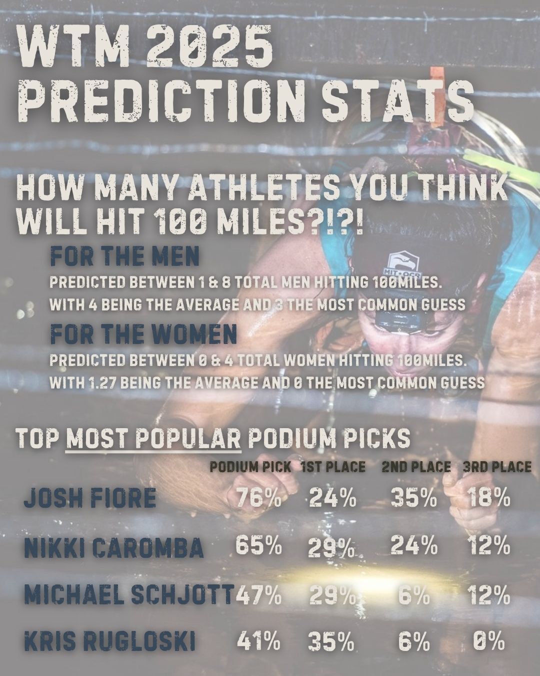 The majority of you picked Josh Fiore to land on the podium. And since he’s been such a consistent 100 mile and WTM podium guy over the years, it’s no surprise.