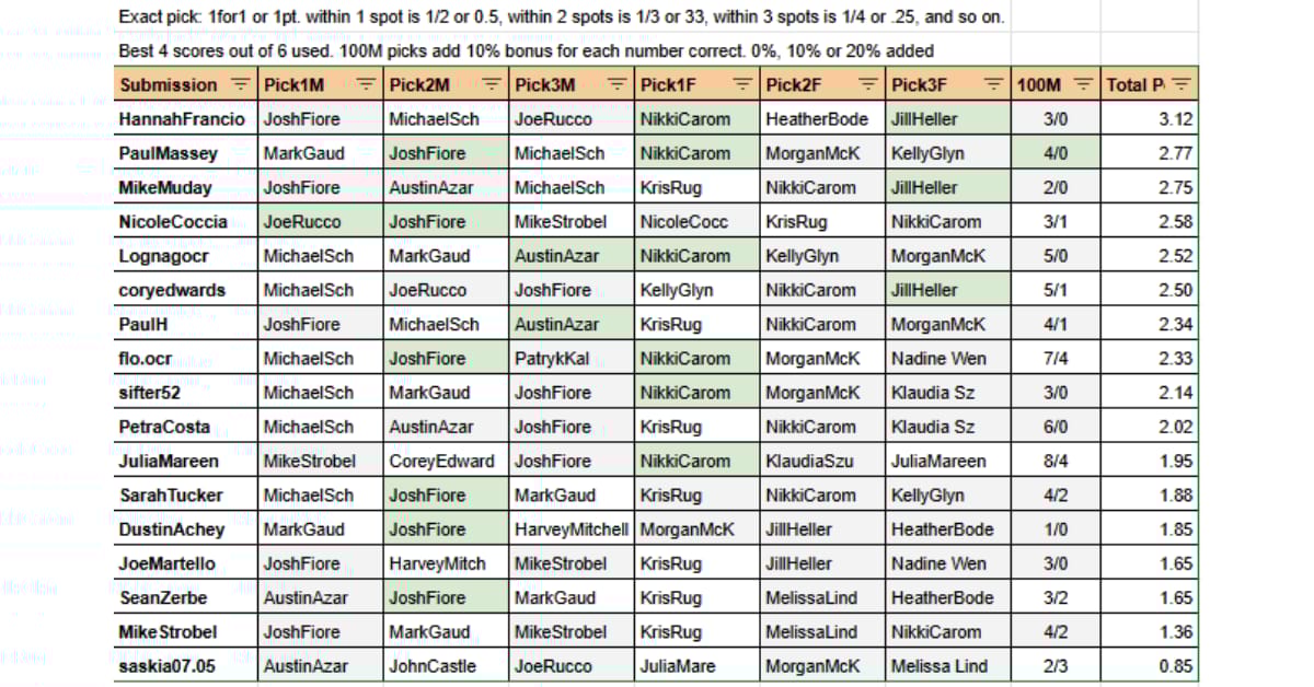 Congrats to Hannah Franciosa who scored the highest, with 2 perfect picks plus Joe & Josh podiuming, (just not in the correct order). 🥇